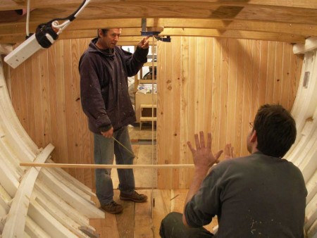 We also started to mock up the internal arrangements. Starting in the forepeak with the mast position and the chain locker. Much discussion has gone in to the design of the chain locker so that when built 200 ft of 3/8th inch chain will self stow and not need anyone down below stopping it piling into an unruly mess. So its going to be a narrow and tall box around which will be the bulkheads which separate the forepeak from the heads.